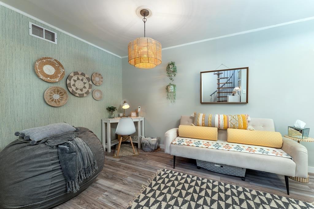 • Lower Level: A private suite-style space with lounge, workspace, full bath, and flexible sleeping options (twin sleeper sofa + Cordaroy’s bean bag that converts into a full bed). The lower level is also accessible through a separate side entrance.